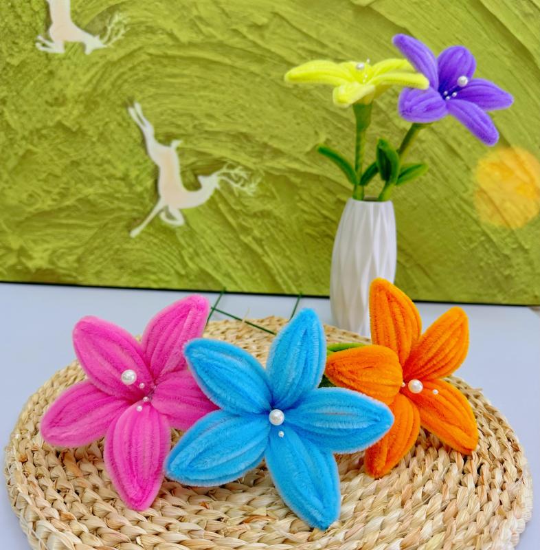 品名:扭扭棒百合仿真花 材质:特密毛线绒,无异味,环保材质 颜色:多色可选,不掉色 创新:一款比真花还鲜艳的手工花,比市面上任何仿真花都逼真 创意:造型多变,可自行diy各种盆栽,插花等造型 优点:纯手工制作,告别机器硬邦邦的套模,造型逼真,颜色鲜艳,触感柔软,与宠物毛发相当。 存放及保养:可用风机吹掉灰尘,产品不防水,建议放在干燥位置,保存妥当可存放数年。 适用场景:可用于花艺造景、盆栽、花束、居家摆件、婚庆布场、商务用花等多用途 公司宗旨:不以低价做市场,只做高品质,服务高质量客户。